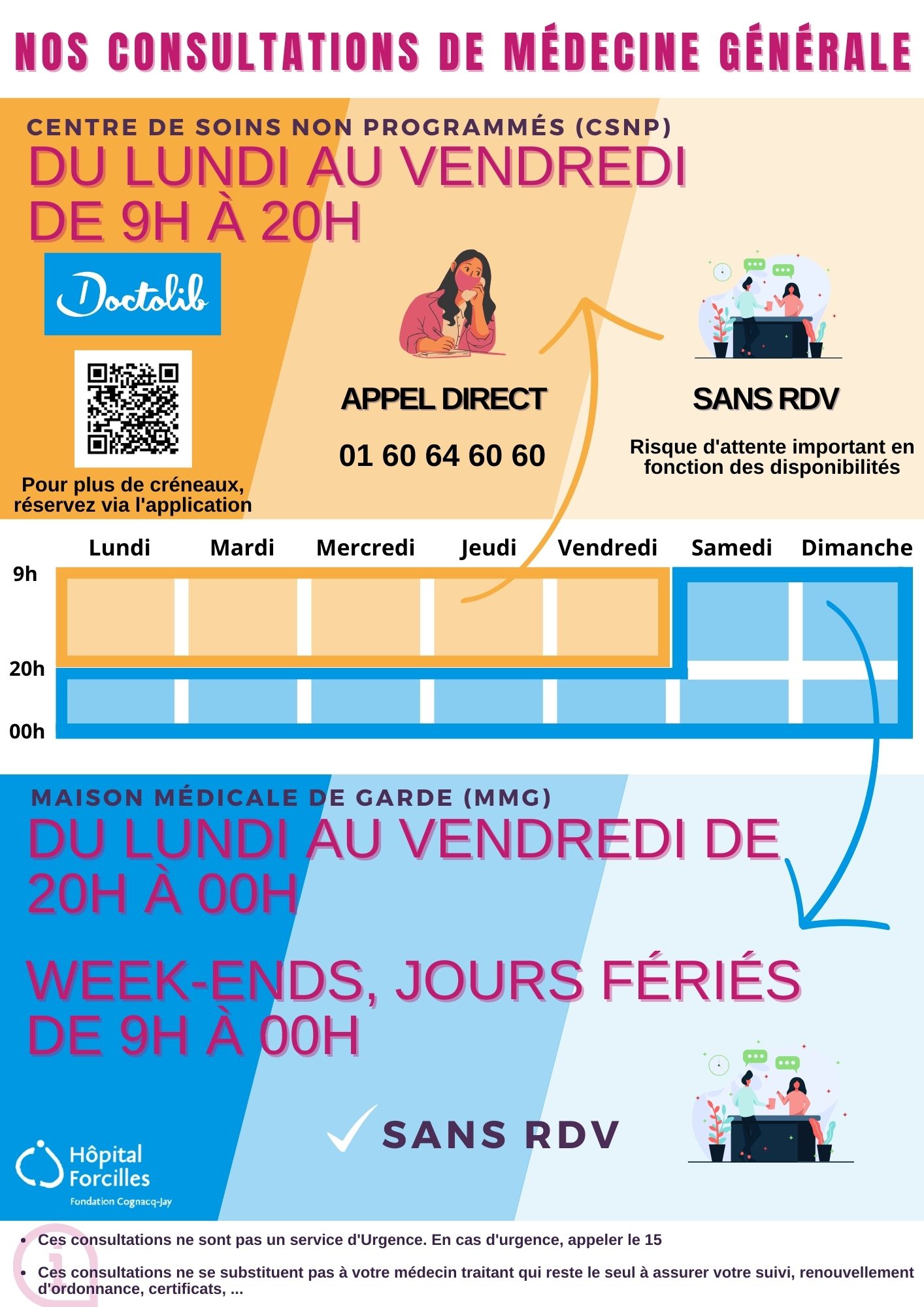 Vient s'ajouter à son Centre de Soins Non Programmés (solution rapide au besoin de consultation en médecine générale dans les 48 heures), une Maison Médicale de Garde qui va ouvrir ses portes le 1er mars 2024 dans les locaux de l’hôpital !