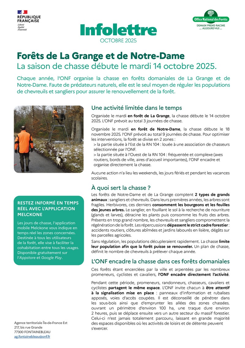 En forêt de La Grange, la chasse débute le 14 octobre et en forêt de Notre-Dame le mardi 18 novembre 2025.